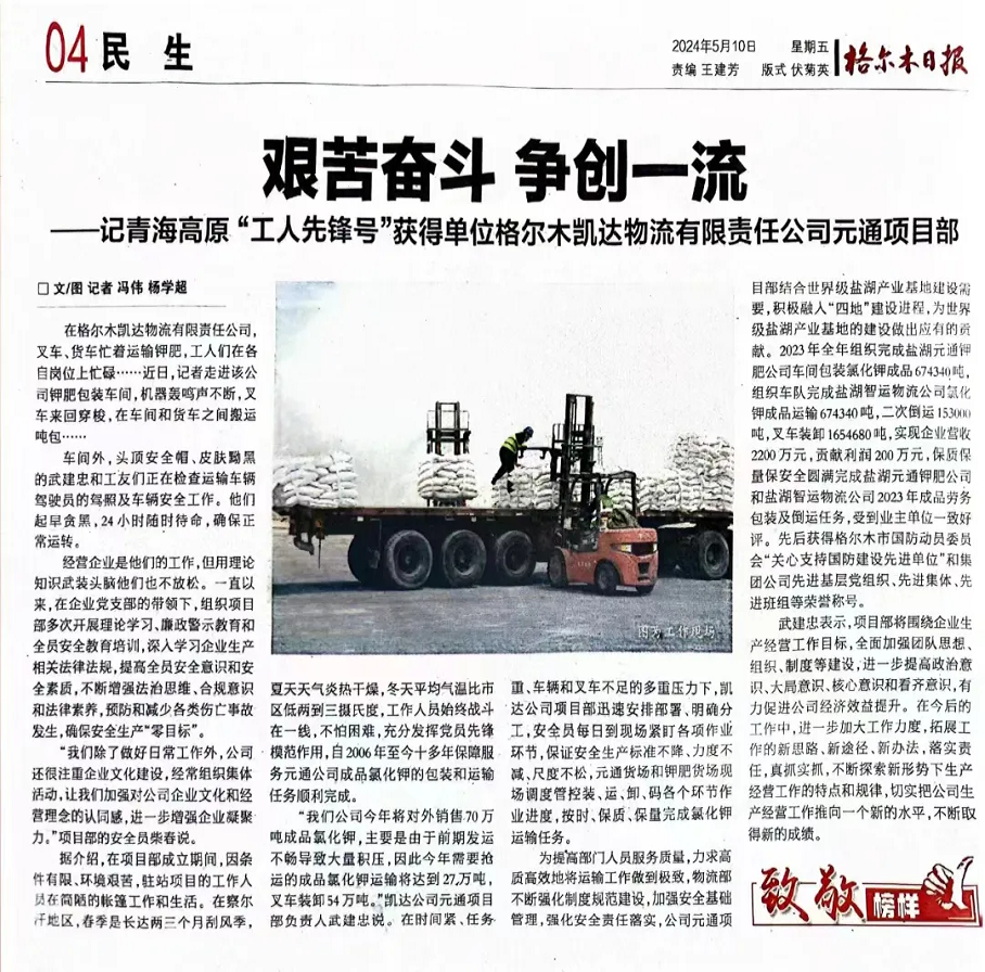 格尔木凯达物流有限责任公司元通项目部是一支真抓实干、深耕业务、争创先锋的团队。他们十几年如一日坚持在海拔3100多米的沙漠戈壁滩,克服高原地区气候干燥、环境恶劣的重重困难,充分发扬“缺氧不缺精神”的高原精神和“越是艰险越向前”的奋斗精神,为加快建设世界级盐湖产业基地奉献了自己的力量。在威廉希尔williamhill中文党委和格尔木生产经营公司党委的坚强领导下,元通项目部全体干部职工思想统一、步调一致,整个项目部形成了团结向上、风清气正的良好氛围。2023年实现营收2200万元,贡献利润200万元,受到业主单位一致好评。元通项目部曾多次受到上级行管部门和党组织荣誉表彰、先进事迹报道,2022年受到西海都市报《奋进新征程建功新时代之假期我在岗赶工促生产》专题报道,同年荣获格尔木市国防动员委员会“关心支持国防建设先进单位”;2023年,被威廉希尔williamhill中文评为“先进班组”等荣誉称号。